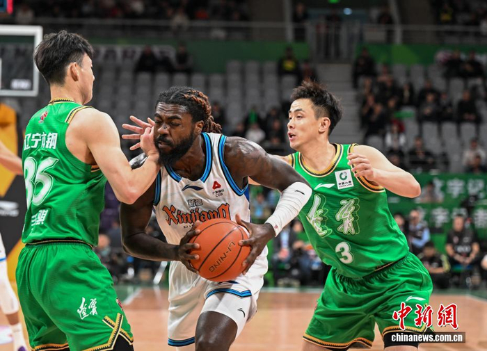 1月16日,在辽宁沈阳举行的2025-2026赛季中国男子篮球职业联赛(CBA)常规赛第15轮比赛中,辽宁本钢队主场82:75胜新疆伊力特队。图为辽宁本钢队球员威尔斯(中)在比赛中带球进攻。中新社记者 于海洋 摄