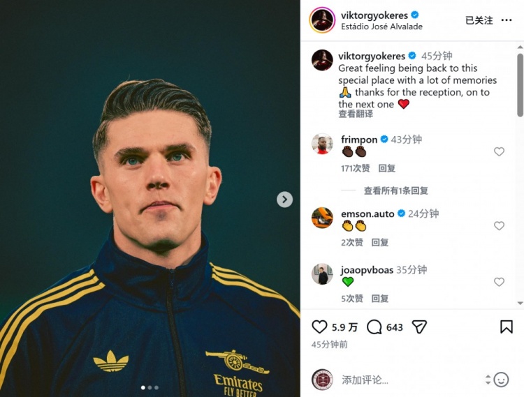 约克雷斯社媒写道:“回到这个充满回忆的特别地方,感觉真的很好。感谢大家的欢迎,专注于下一场比赛。”